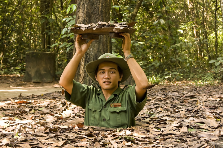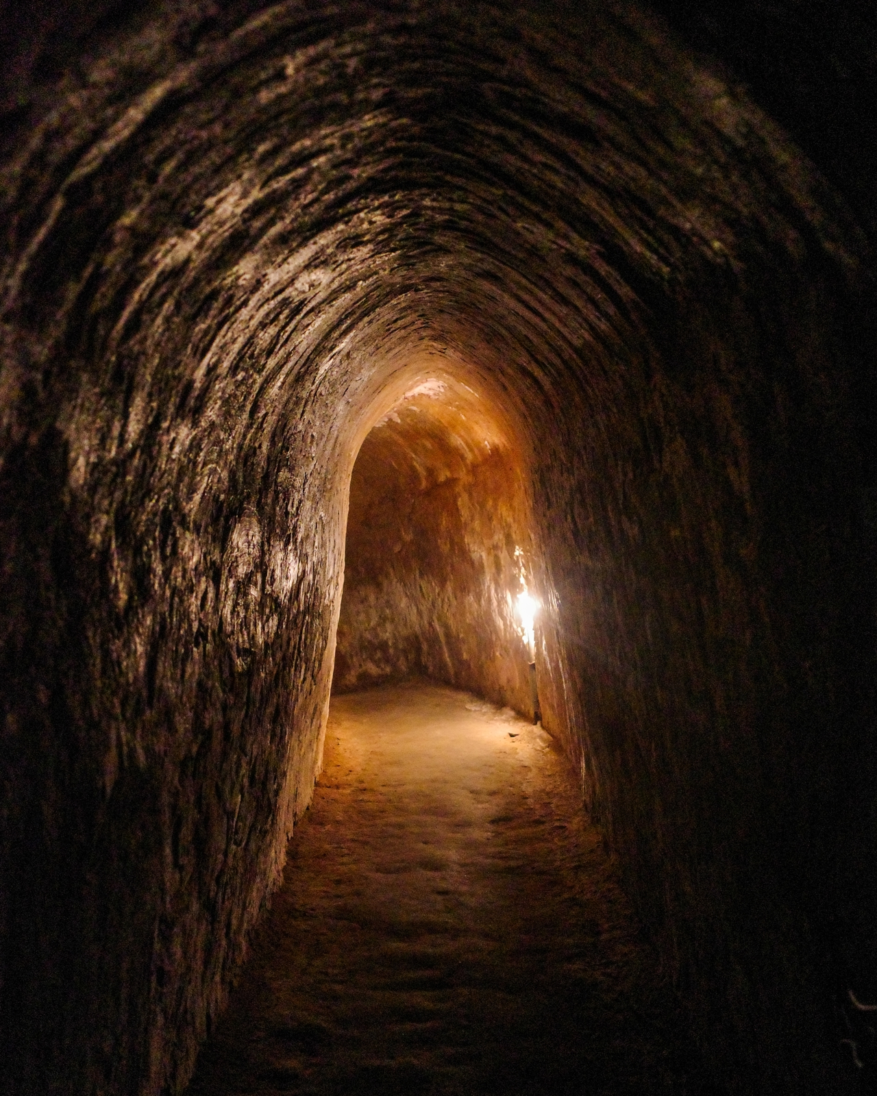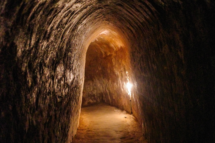 Σε μία καταπράσινη περιοχή, θα συναντήσετε τα περίφημα δαιδαλώδη υπόγεια τούνελ, τα οποία κατά τη διάρκεια του πολέμου του Βιετνάμ, αποτελούσαν κρησφύγετο των Βιετκόνγκ. Τα τεράστια δίκτυα από σήραγγες χρησιμοποιήθηκαν ως κρυψώνες, οδοί επικοινωνίας και ανεφοδιασμού, νοσοκομεία, κρύπτες τροφίμων και όπλων και χώροι διαβίωσης για πολλούς μαχητές του Βόρειου Βιετνάμ. Τα συστήματα σήραγγας είχαν μεγάλη σημασία για τους Βιετκόνγκ στην αντίστασή τους και βοήθησαν στην αντιμετώπιση της αυξανόμενης αμερικανικής στρατιωτικής παρουσίας, ενώ παράλληλα περιείχαν διάφορες παγίδες μπαμπού που κατασκευάστηκαν για να τραυματίζουν ή να σκοτώνουν τους εχθρούς. Οι σήραγγες περιείχαν επίσης άξονες εξαερισμού για την απελευθέρωση καπνού από τη φωτιά και τυχόν δηλητηριώδη αέρια που διοχετεύονταν οι αμερικανικές δυνάμεις.