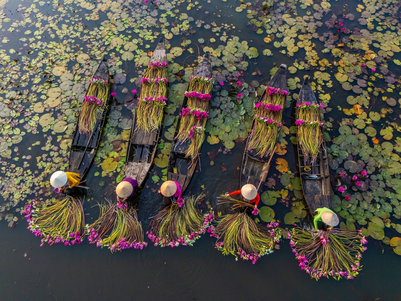 Ακολουθώντας μία διαδρομή 1 ½ ώρας, θα φτάσουμε στο Δέλτα του Μεκόνγκ. Από την μαρίνα Μι Το, θα ξεκινήσουμε την ξενάγησή μας με πλοιάριο, ακολουθώντας μία διαδρομή κατά μήκος του ποταμού Τιέν (μία από τις εννέα εκβολές του Μεκόνγκ ή αλλιώς ένας από τους εννέα δράκους). Έτσι θα έχουμε την ευκαιρία να δούμε τα ιχθυοτροφεία και θα σταματήσουμε στο νησάκι Κάι, για να εξερευνήσουμε την αγροτική ζωή σε ένα αγρόκτημα με εποχιακά φρούτα, δοκιμάζοντας φρέσκες καρύδες νερού. Απολαμβάνοντας το υπαίθριο τοπίο, θα πάρουμε το γεύμα μας σε τοπική ταβέρνα και έτσι θα δοκιμάσουμε το διάσημο «αυτί του ελέφαντα», ένα νόστιμο ποταμίσιο ψάρι. Τέλος θα απολαύσουμε μία βόλτα με κανό στα φοινικοδάση που διακοσμούν τα μικρά κανάλια (μην ξεχάσετε να αποθανατίσετε την υπέροχη διαδρομή φορώντας κωνικά παραδοσιακά καπέλα). Με μικρά αυτοκίνητα θα επισκεφθούμε εργαστήρια παρασκευής καραμέλας από καρύδα και θα ξεκινήσουμε την διαδρομή της επιστροφής μας στη Σαϊγκόν.